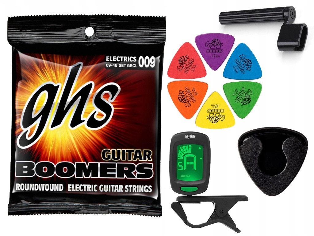 Struny GHS GBCL do gitary elektrycznej w zestawie korbka + tuner + 6 kostek + pojemnik